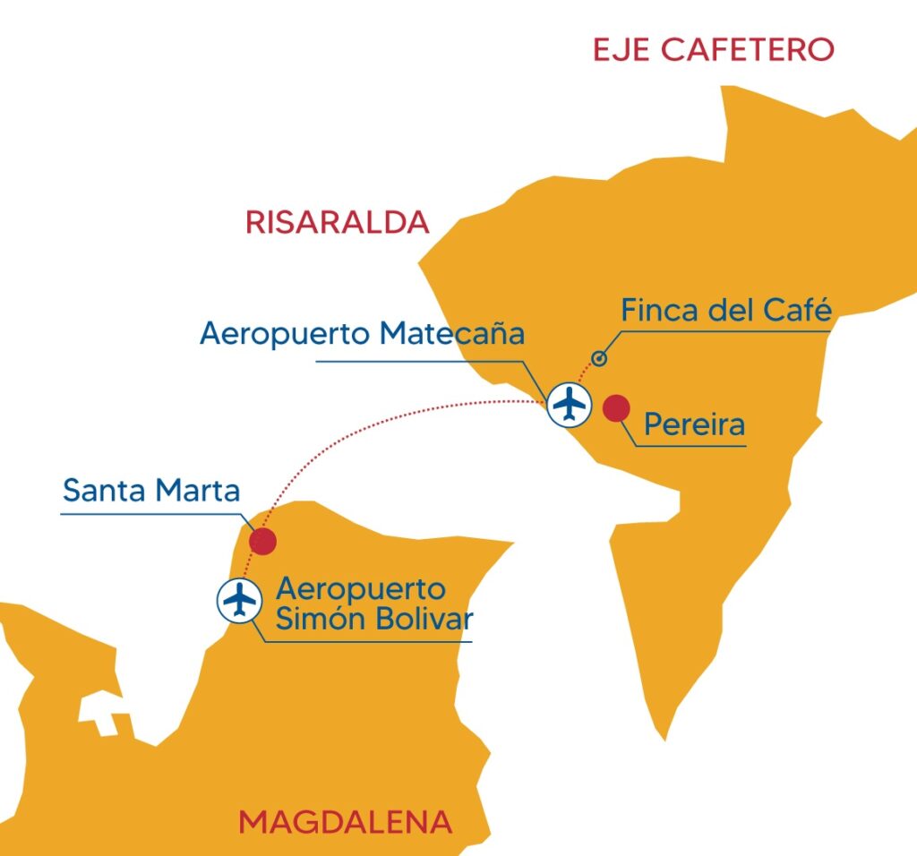 – A la hora acordada, salida hacia el aeropuerto de Santa Marta para tomar el vuelo con destino Pereira en el Eje Cafetero.